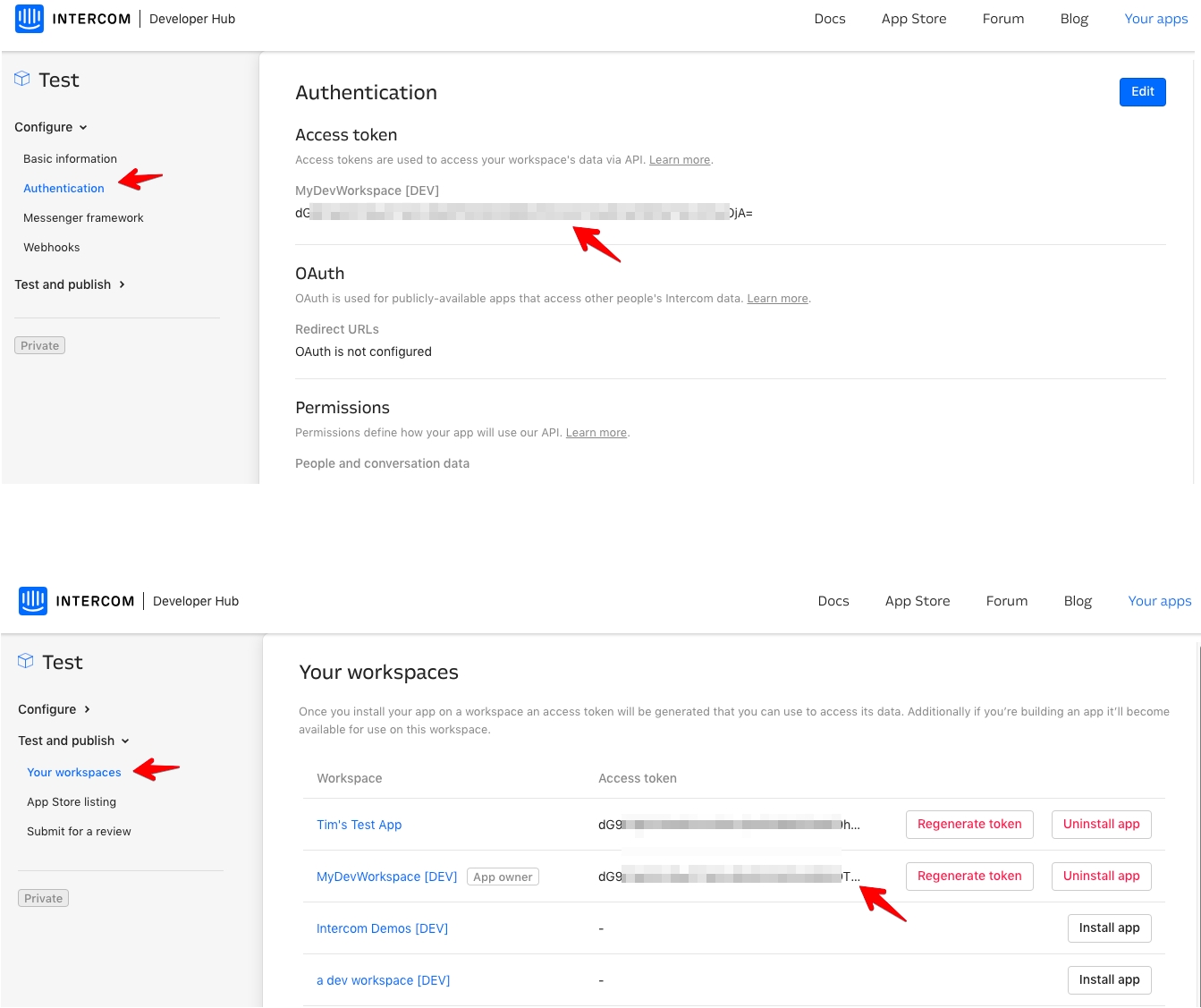 You can find your Access Token following this path Configure > Authentication inside Intercom's Developer Hub.