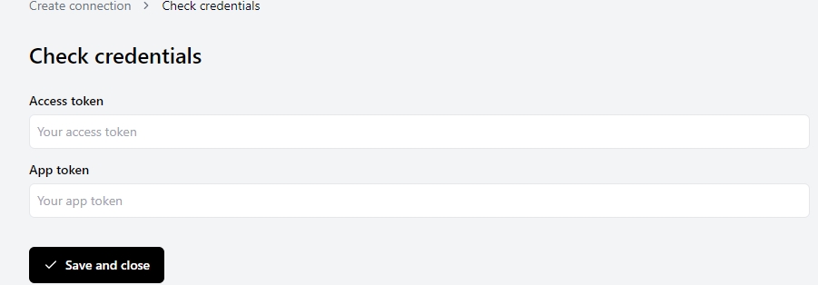 Now paste the App Token and Access Token values in the correct fields of the Erathos platform. Don't forget to click on Save and close to advance to the next steps of the integration.