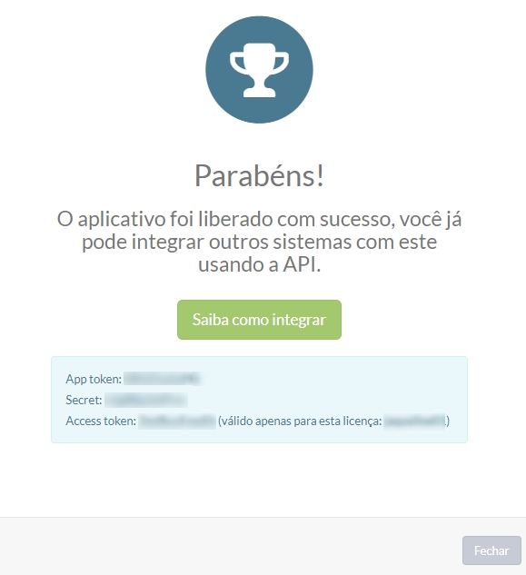 In the next page, the system wil, display the App token, Secret and Access token values. Only the App Token and Access token values are necessary for the connection.